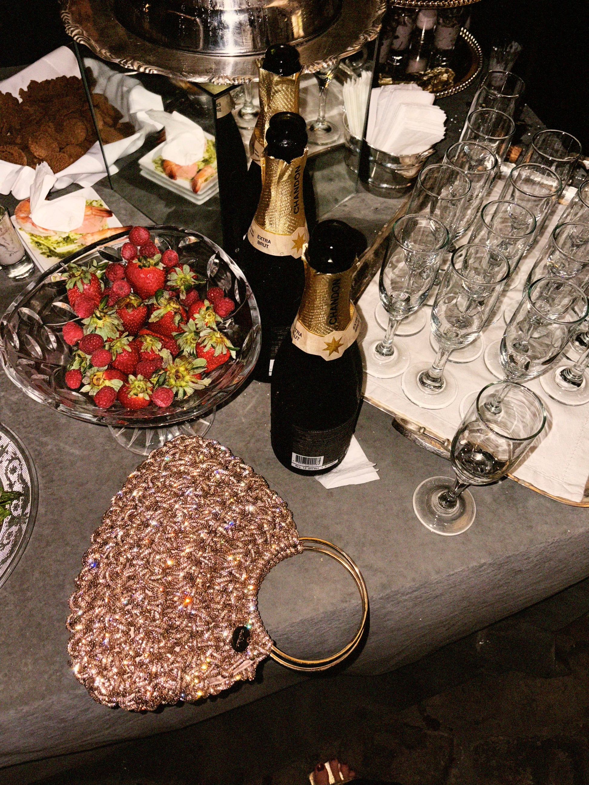 Bolso tejido a mano con un hilo muy especial de cristales, con forro satinado, broche y asa corta en forma de argolla de metal.